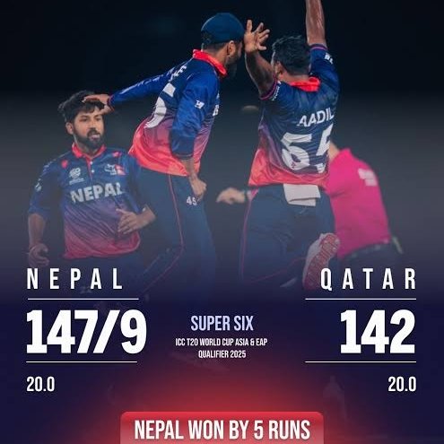 नेपालले ICC पुरुष T-20 विश्व कप एसिया र ईस्ट एशिया प्यासिफिक छनोट सुपर सिक्स अन्तर्गत कतारमाथि पाँच रनको जित दर्ता गरेको छ। यो जितले नेपाली क्रिकेटमा नयाँ इतिहास बनाएको छ। सोमबार ओमान क्रिकेट एकेडेमी टर्फ-१, अल अमेरातमा भएको खेलमा नेपालले १४८ रनको लक्ष्य सेट गर्‍यो, र कतारले १९.५ ओभरमा मात्र १४२ रन बनाउन सक्यो।